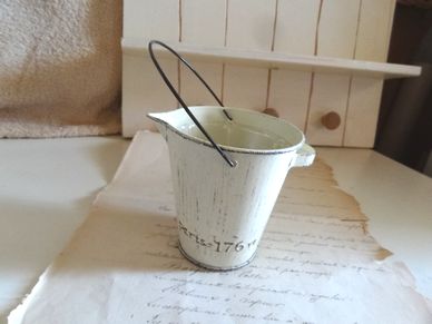 アンティーク風のデザインの素敵なピッチャー型のポットです。ブリキ製でフレンチ風のデザインになってます。グリーンを入れたりインテリアにもぴったりです。塗料が剥げたようなデザインになっています。大きさは横10cm、高さ8cm、内径7.5cm位です。