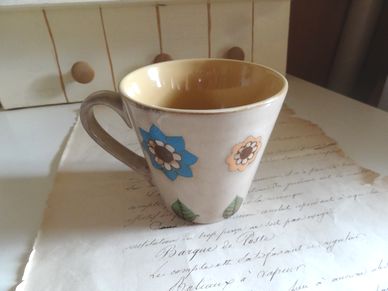 北欧風のほっこりした陶器のマグカップです。スープや温かい飲み物にピッタリです。大きさは横10.9cm、縦7.6cm位です。