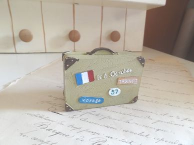 フレンチ風の小さなトランクです。レジン製になってます。ガーデンやインテリアにも。ナチュラルなデザインが素敵です。大きさは縦5.5cm、横7cm、厚み3.5cm位です。