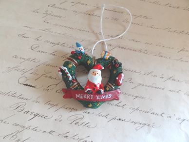 可愛いレジン製のオーナメントです。小さなリースの中にサンタがいます。インテリアやお庭に*ぶら下げてオーナメントにも。大きさは横4.5cm、縦5.5cm位です。