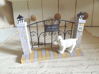 フレンチ風のデザインの小さなフェンスと子犬のオーナメントです。お庭の飾りやインテリアにも。大きさは横9.8cm、縦6.8cm、奥行き2.6cm位です。