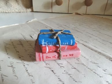 ミニサイズの本を束ねたようなレジン製のオーナメントです。古い雰囲気を出すためにムラのある塗装になっています。お庭やインテリアの飾りに素敵です。英字もフレンチ風デザインになってます。大きさは横4.6cm、縦2.7cm、奥行き3.3cm位です。