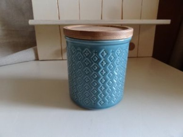 北欧風のほっこりした陶器のフタ付きキャニスターです。木の蓋はパッキン付きです。フタを外して電子レンジ、食洗機、食器乾燥機OKです。大きさは横9.5cm、縦11cm位です。