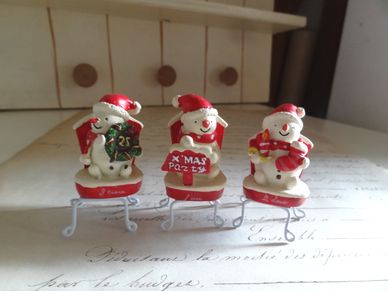 可愛いレジン製のオーナメントです。スノーマンが椅子に座っているデザインがとっても可愛いです。3点セットです。インテリアやお庭に。大きさは横2.5cm、縦4.8cm、奥行き2.3cm位です。