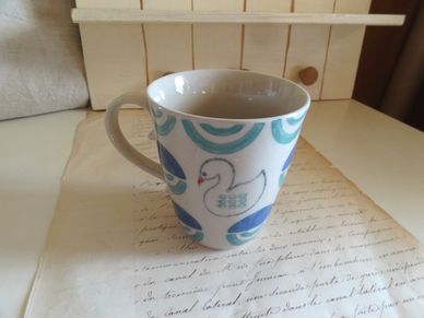 北欧風の白鳥のイラストが素敵な陶器のマグカップです。大きめなのでたっぷりのコーヒーやスープなどにも。大きさは横8.5cm、縦9.5cm位です。