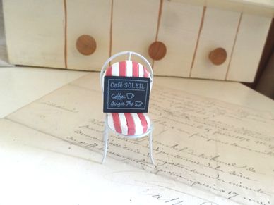 フレンチ風のデザインの小さなクッション付きのチェアーのオーナメントです。お庭の飾りやインテリアにも。大きさは横3cm、縦6.3cm位です。