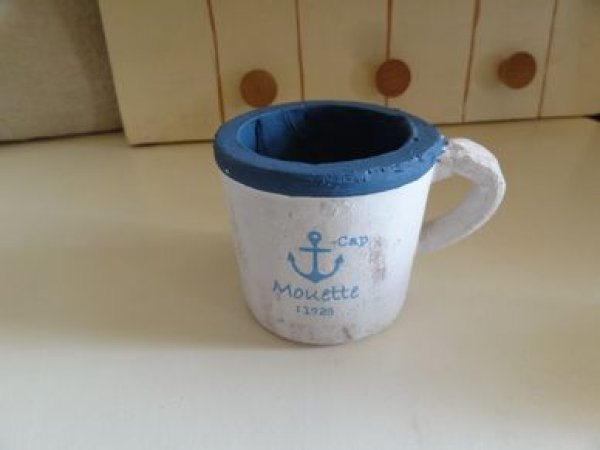 ナチュラルなデザインの石膏で出来たようなカップです。アンティークなマリン風デザインになってます。インテリアに素敵です。中身は素焼になっています。大きさは横8.5cm、縦6cm、奥行き6.5cm位です。