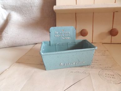 アンティーク風のデザインの素敵なポットです。ブリキ製でフレンチ風のデザインになってます。グリーンを入れたりインテリアにもぴったりです。石鹸入れのようなデザインです。大きさは横10cm、高さ7cm、奥行き5.5cm、内径9.5cm×5cm位です。