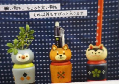 可愛いこけしがテーマのスタンドタイプのペンスタンドです。木製になっています。頭の中央に1.7cmのペンを入れる穴があいています。大きさは横4.6cm、縦12.8cm位です。