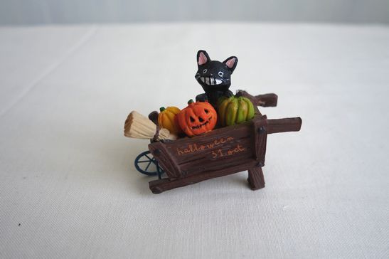 ハロウィンの飾りです。楽しい猫のカートのデザインになっています。とっても可愛いです。お部屋のインテリアに*大きさは横6.5cm、縦5.2cm位です。