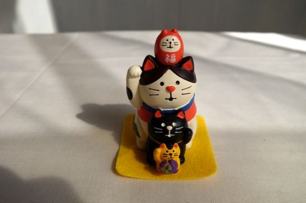 可愛いデザインのポリレジン製の置物です。たくさんの福を招く招き猫になっています。右手で金運、左手で人を招きます。インテリアにも。フェルトマット付きです。大きさは横4cm、縦6.8cm位です。