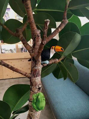ポリレジン製の観葉植物などに取り付けて楽しむマスコットです。本物のようなデザインになっています。お部屋のインテリアやガーデニングにも。足のワイヤーで木などに巻き付けます。大きさは横10.5cm、縦5.5cm位です。