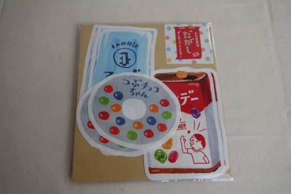 レトロなデザインが可愛いレターセットです。だがしの形をした便箋が素敵です。封筒が3枚、便箋が3柄がアソートで6枚のセットになっています。大きさは封筒が縦9.2cm、横14.2cm位です。