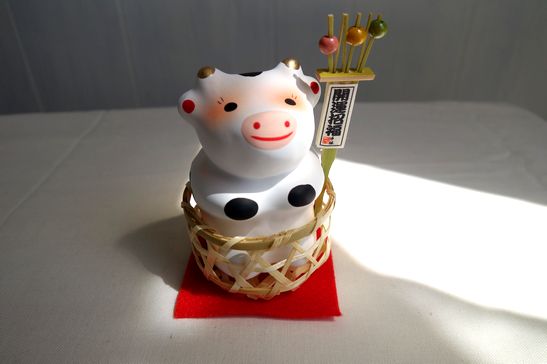 陶製のマスコットです。素朴なデザインがとっても可愛いです。かごに入って熊手を持っています。お部屋のインテリアにも。大きさは横6.5cm、縦10.5cm位です。