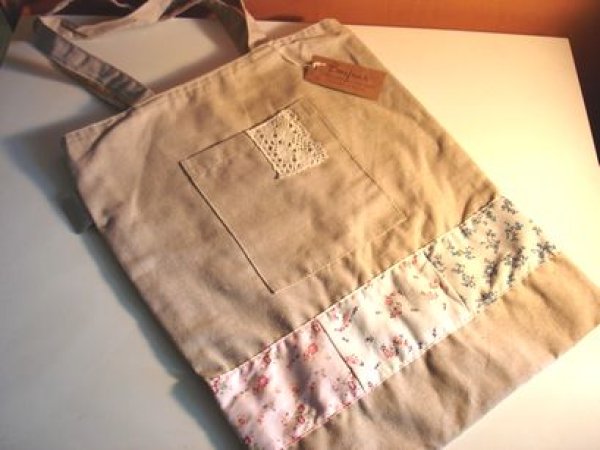 リネン素材の可愛い大きめバッグです。3色の花柄のパッチワークがとってもおしゃれです。外のポケットにレースの飾りがついています。中にもポケットがついています。大きさは縦40cm×横30cm、もち手は22cm位です。