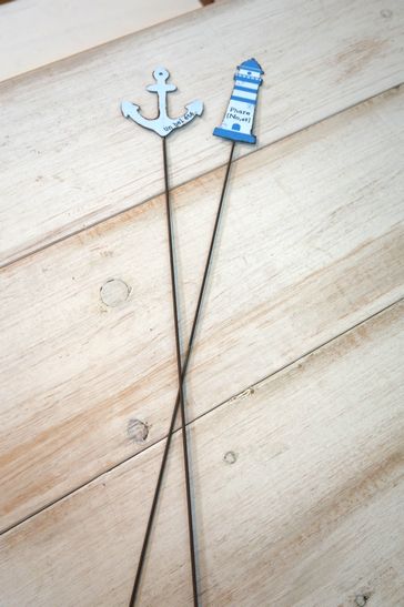 マリン風デザインが素敵なブリキのガーデンピックです。お庭のディスプレイに。2点セットです。アンティーク風の風合いをだすために部分的にはがしたり、錆のような加工がデザインされています。大きさはアンカーが横6cm、縦65cm位です。