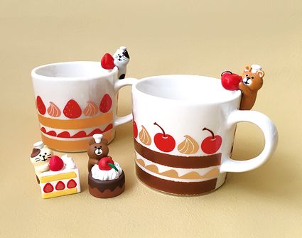 子猫がスイーツ作りしているような可愛いマグカップです。小さなマスコットがちょこんと付いています。陶器製です。電子レンジは不可です。大きさは横9cm、縦10cm位です。