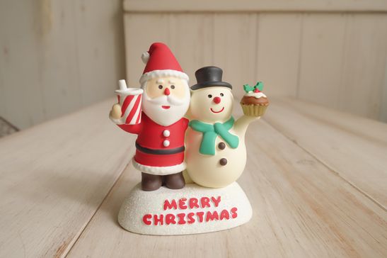 キュートなデザインのレジン製のマスコットです。サンタとスノーマンが可愛いマスコットです。クリスマスのインテリアなどのワンポイントに。大きさは横6.4cm、高さ7.8cm位です。
