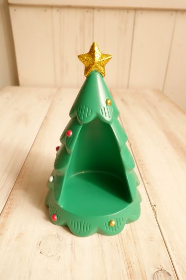 キュートなデザインのレジン製のツリーです。中にマスコットなどを飾れます。クリスマスのインテリアなどのワンポイントに。後ろは普通のツリーとして飾れます。大きさは横9.2cm、高さ14cm位です。
