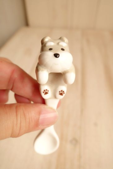 可愛いシュナウザーのデザインの陶器のスプーンです。カップのふちにつかまるように引っ掛けられるデザインになっています。大きさは横2.0cm、縦10.6cm位です。