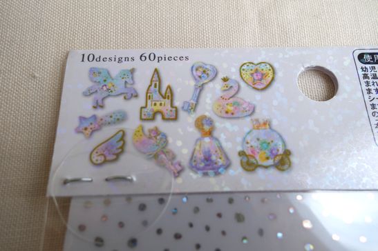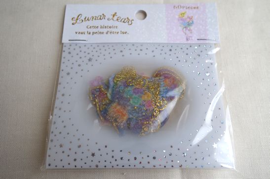 素敵な柄の透明タイプの素材のフレークシールです。透明プラ素材に閉じ込められたようなデザインになっています。60枚のセットです。大きさはパッケージが横10cm、縦10.5cmです。