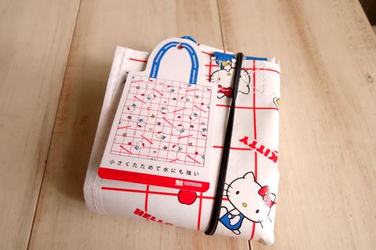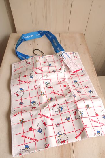 ポリエチレン素材のエコバッグです。レトロなサンリオ柄がとっても可愛いです。折りたたんでコンパクトにゴムでまとめられます。大きさは横31.5cm、縦36cm位です。