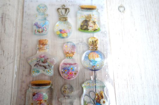 メルヘンなイラストが素敵なぷっくりしたドロップタイプのシールです。ノートや手帳、携帯などにも。中にキラキラした飾りが瓶の中にとじこめられているようなデザインがとっても可愛いです。大きさは台紙が横7.5cm、縦19.8cm位です。