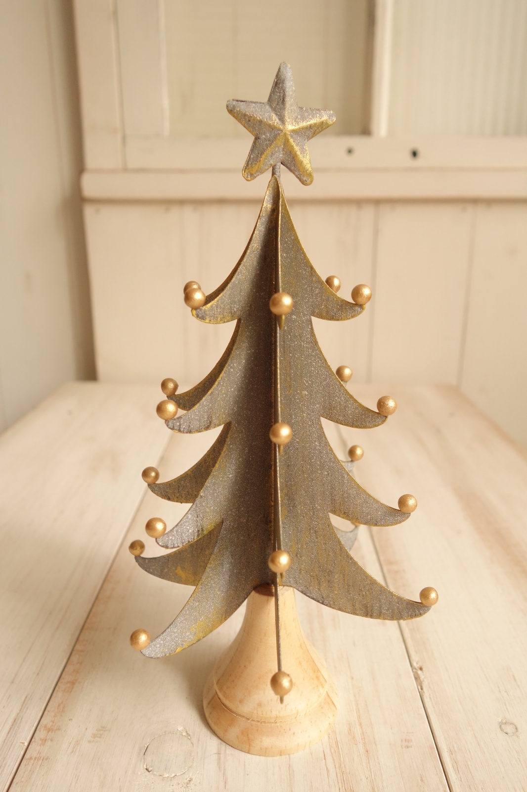 木とティン素材のツリーです。ナチュラルなデザインがとっても可愛いです。大きさは横11.5cm、縦21cm位です。