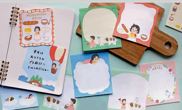 ほっこりイラストで描かれたハイジのデザインのブロックメモです。4柄になっています。4柄が各25枚、100枚のセットでたっぷり使えます。大きさは縦9.3cm、横9cm、厚み1.1cm位です。