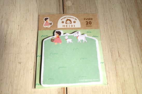 ほっこりイラストで描かれたハイジのデザインの付箋です。型抜きタイプでメッセージカードやメモ替わりにも可愛く使えます。20枚綴りです。大きさはパッケージが縦12.5cm、横8.3cm位です。