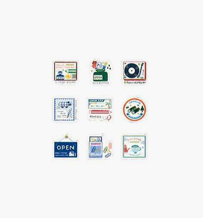 作家さんのイラストが可愛いフレークシールです。手帳やラッピングなど色々な用途に使えそうです。9柄が各6枚の54枚のセットです。マスキングテープ素材です。大きさはパッケージが横9cm、縦10cmです。