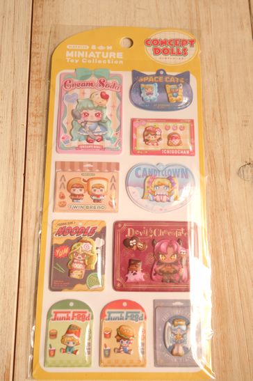 ミニチュアをパッケージしたようなぷっくりしたカプセルに入ったようなシールです。ノートや手帳、携帯、シール帳、キーホルダーなどにも。大きさは横9cm、縦17.5cm位です。