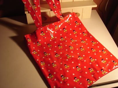 ビニールコーティングされた可愛いフラットトートです。中にポケットがついています。大きさは縦31cm×横35.5cm位です。