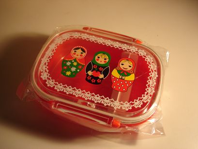 可愛いマトリョーシカのプラスチックのランチボックスです。1段タイプになっています。仕切りがついています。耐熱温度は-30℃〜140℃です。電子レンジはふたをはずしてお使い下さい。大きさは横14cm、縦9cm奥行き4.5cm位です。