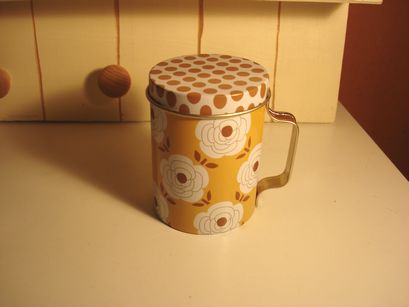 レトロ風の花柄が可愛いブリキ缶のキャニスターです。春らしい色合いが素敵です。キャップを開けて中に色々入れられます。大きさは横6.4cm、縦8.2cm位です。