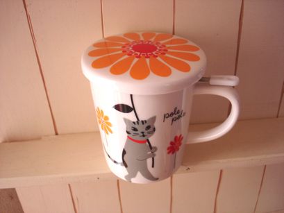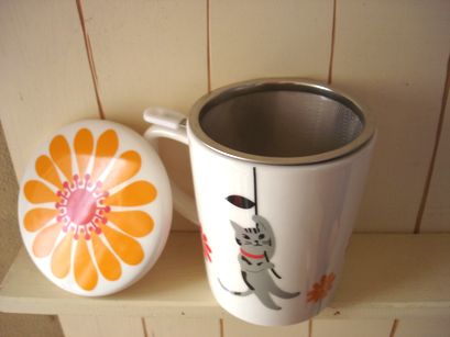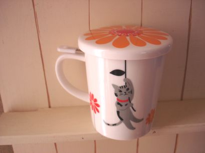 キュートなデザインのふたつきのマグカップです。陶器製です。茶こしつきで紅茶やお茶も気軽に飲めます*ナチュラルなデザインが素敵です。大きさは横9.2cm、縦10.4cm位です。