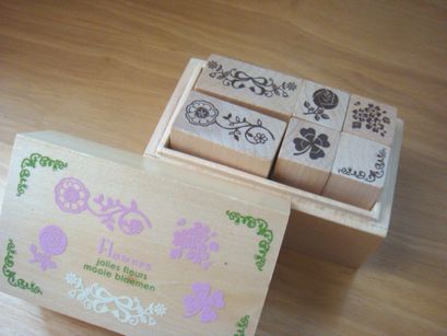 木製のフラワーがモチーフのスタンプセットです。素敵なデザインばかりが5種類セットになっています。便箋や封筒、カードやラッピング、ハンドメイドなどにも便利です。箱の大きさは横10.9cm、縦6.4cm、厚み7cm位です。