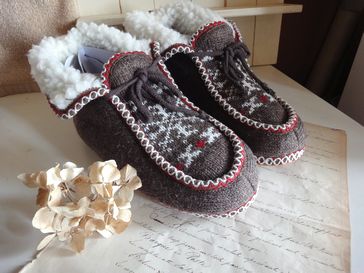北欧風のデザインが素敵なルームシューズです。ナチュラルなファッションにもぴったりのデザインです。周りはニット、中はファーになっていてとってもあったかです。リボンのひもや歯周も可愛い。大きさはフリーサイズです。