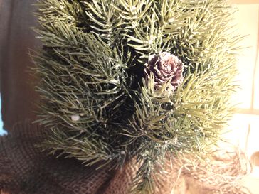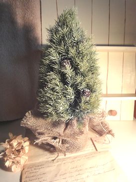 ナチュラルうっすら雪をかぶったようなツリーです。松ぼっくりや麻のカバーなど素朴なデザインがとっても素敵です。インテリアに。大きさは横16cm、縦36cm位です。