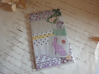 コラージュ柄がおしゃれなデザインのぽち袋です。レースやチロリアンテープ、ボタンやチャーム、切手やはぎれなど素敵な小物のコラージュになってます。裏の留めるところはボタンのデザインになってます。大きさは横6.5cm、縦11cmです。