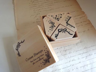 木製のナチュラルなデザインのコーナースタンプセットです。素敵なデザインばかりがセットになっています。カードやレター、ラッピング、ハンドメイドなどにも便利です。箱の大きさは横8cm、縦8cm、厚み5cm位です。
