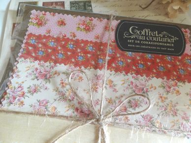 花柄が素敵なレターセットです。ボタンや刺繍糸がコラージュされたシールもついてます。便せんは各3柄が2枚計6枚、宛名シール3枚、刺繍糸2種、ステッカーがついています。大きさは便せんが横13cm、縦16.5cm封筒が横14.5cm、縦9.5cm位です。