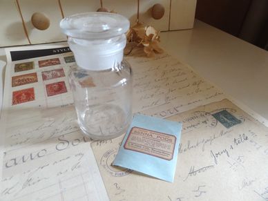 アンティーク風デザインのメディスンボトルです。レトロな風合いのガラスがインテリアにとっても素敵。アンティーク風のラベルが付いています。要領は60mlです。大きさは横が4.3cm、縦が8.5cm位です。