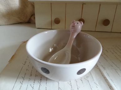 可愛いデザインの陶器のボウルとスプーンのセットです。水玉がらのボウルに動物のスプーンが付いていてとっても可愛いです♪プレゼントにも。スープなどを入れると温泉につかっているようなデザインになります。電子レンジOKです。大きさは横12cm、縦5.8cm位です。