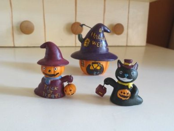 ハロウィンの飾りです。小さなオーナメントの3点セットです。中お家に飾れば一気にハロウィンらしくなります*大きさはハウスが横5.5cm、縦6cm位です。