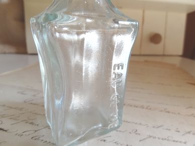 アンティーク風デザインのガラスのボトルです。レトロな風合いのガラスがインテリアにとっても素敵。アンティーク風の英字の浮かし柄が入っています。大きさは横が4.5cm、縦が10cm位です。
