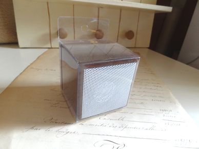 ポップなデザインが可愛いスピーカーです。ipodやMP3などの再生機器につないで使用することが出来ます。3.5mmのステレオ差しこみミニプラグがついてます。単4電池3本で使えます。野外や車の中でも使えます。大きさは横5.9cm、縦6.2cm位です。