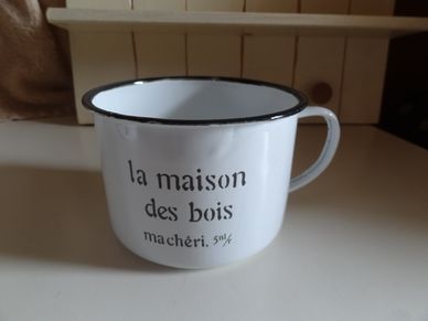 アンティーク風デザインのホーローのカップです。英字のデザインがフレンチ風で素敵です。お部屋のインテリアに。大きめなのでグリーンなどを入れても。大きさは縦14cm、横7.5cm位です。