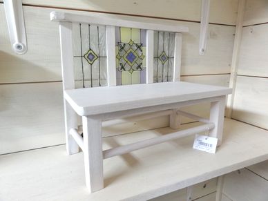 アンティークななデザインの素敵なステンドグラスのミニベンチです。窓辺に置いて光を通すともっと素敵です。小物などを飾ったりインテリアに。大きさは横30cm、縦25cm、厚み14cmになっています。
