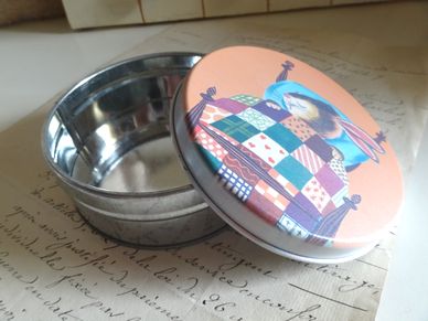 童話をモチーフにした可愛いデザインのブリキのフタ付きの小物入れです。収納やインテリアに。レトロな柄が素敵です。大きさは横10cm、厚み3.5cm位です。
